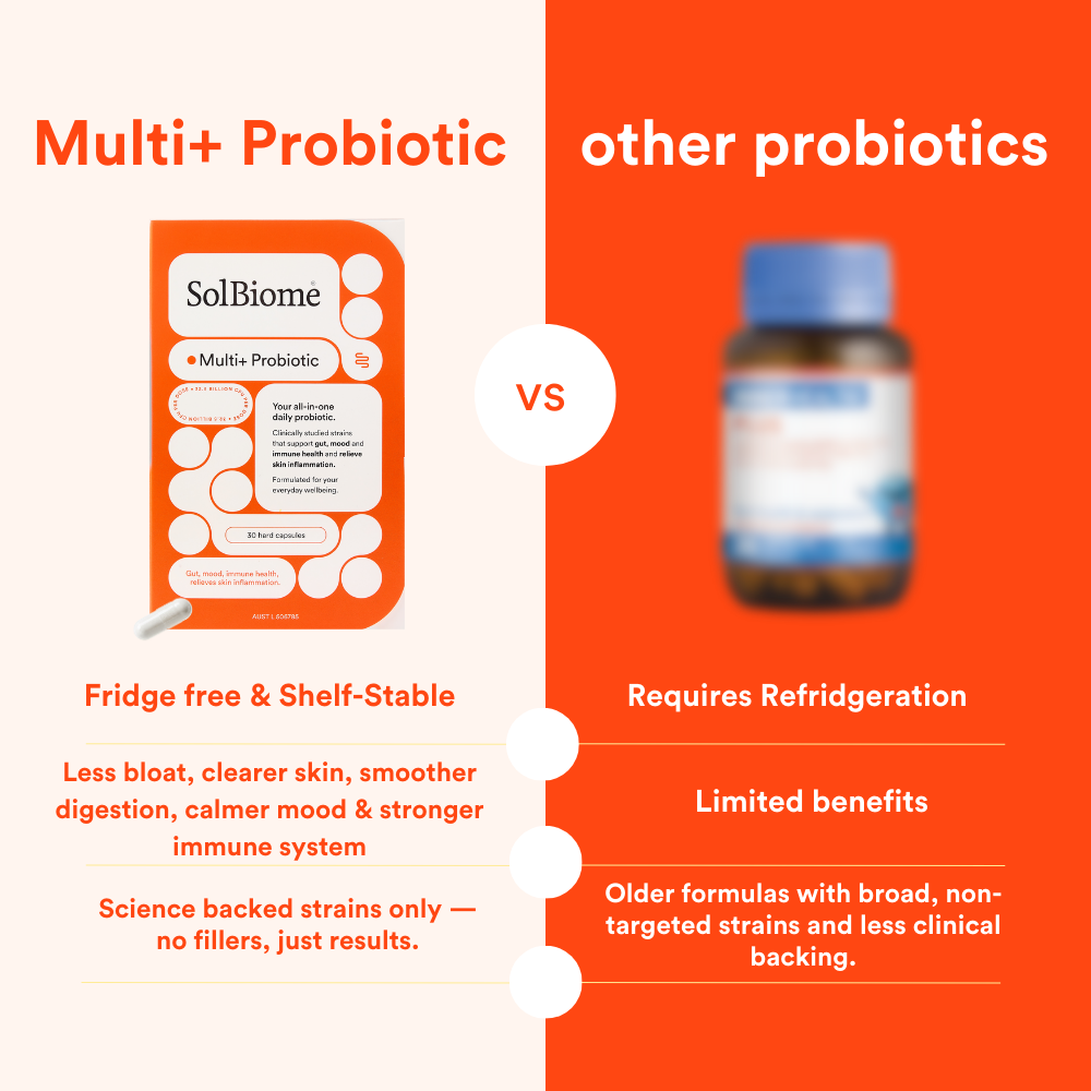 No. Multi+ contains no artificial preservatives, no artificial colours or flavours, and no unnecessary fillers. These excipients simply ensure the probiotic strains remain alive, stable, and effective from manufacturing to ingestion.